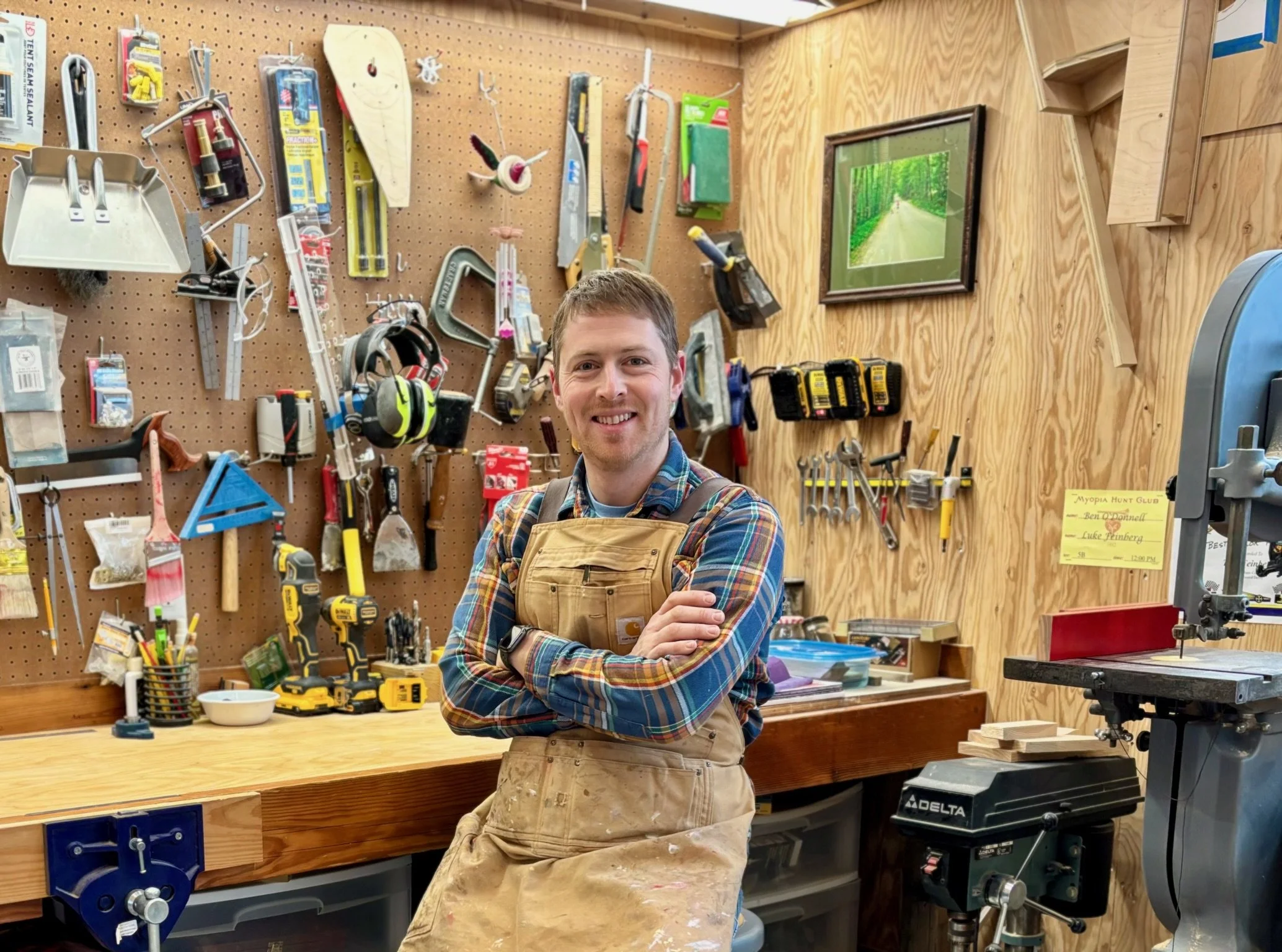 Man standing in woodworking shop with arms crossed, wearing apron and plaid shirt, surrounded by tools and equipment on pegboard and workbench.